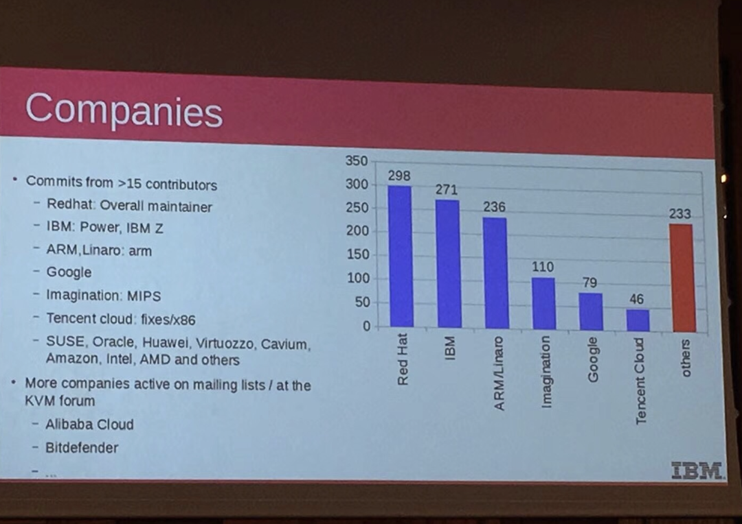 这个突破性的贡献也为腾讯云在社区赢得了广泛赞誉。随后的2017年,凭借在这一领域的持续贡献,腾讯云受邀在KVM Forum上发表主题演讲,这也是国内云厂商代表中的首次。
