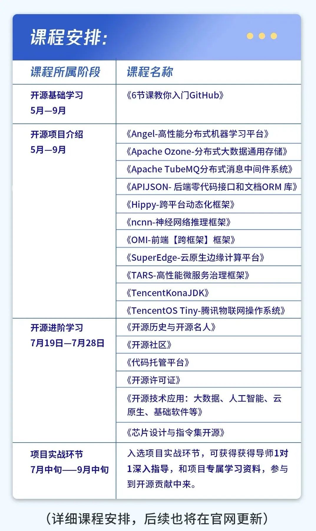 各阶段开源培养课程整体安排如下(详细上课安排将于7月中旬推出,敬请关注),同学们可进入“腾讯犀牛鸟开源人才社区”听课: