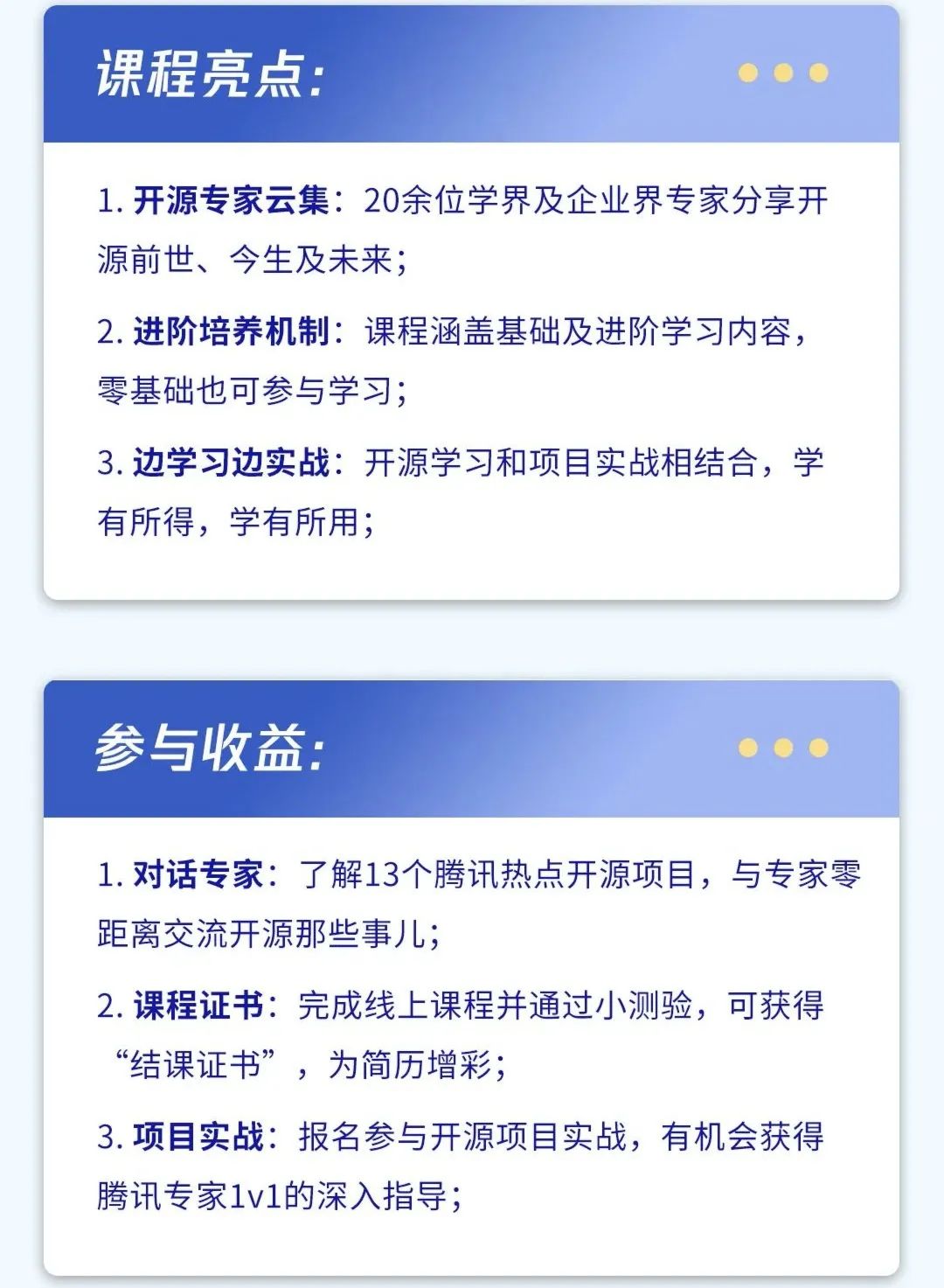 7月19日,我们将启动”腾讯犀牛鸟开源进阶研学“系列课程(详细课表见下方《课程安排》),6月21前报名过即可参与(不用提交proposal),学习时间为7月19日——7月28日。