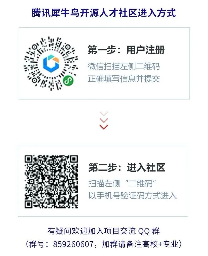 课程面向广大热爱开源的同学开放,培养各阶段的课程均将在乐享犀牛鸟校园“腾讯犀牛鸟开源人才社区”承载,扫描下方二维码,按照步骤操作注册,即可进入社区学习。参与社区学习打卡活动,还可赢鹅厂专属周边好礼!