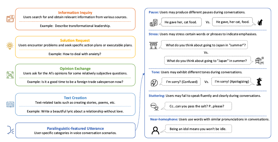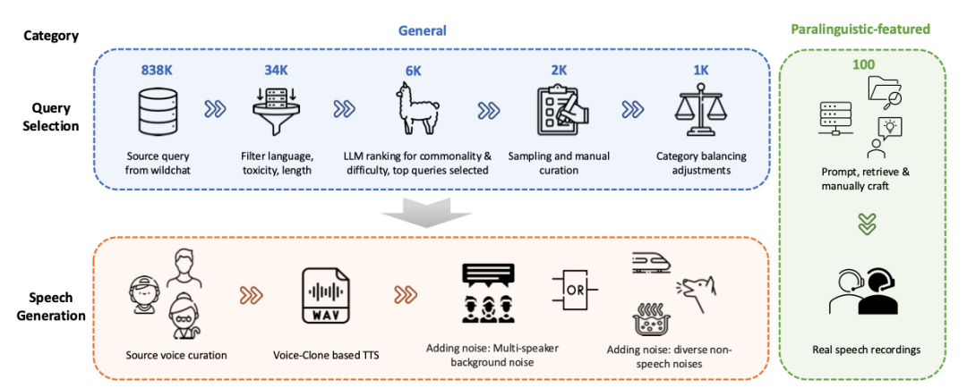 1. 真实场景筛选:从 WildChat 数据集提取 1000 条单轮对话,覆盖信息查询、解决方案请求等 5 大核心类别,剔除长文本(<50 词)和其他不适合语音场景出现的数据(例如代码、数学等等)。除此之外,还人工精心构造100条「语音/语义陷阱」的题目。