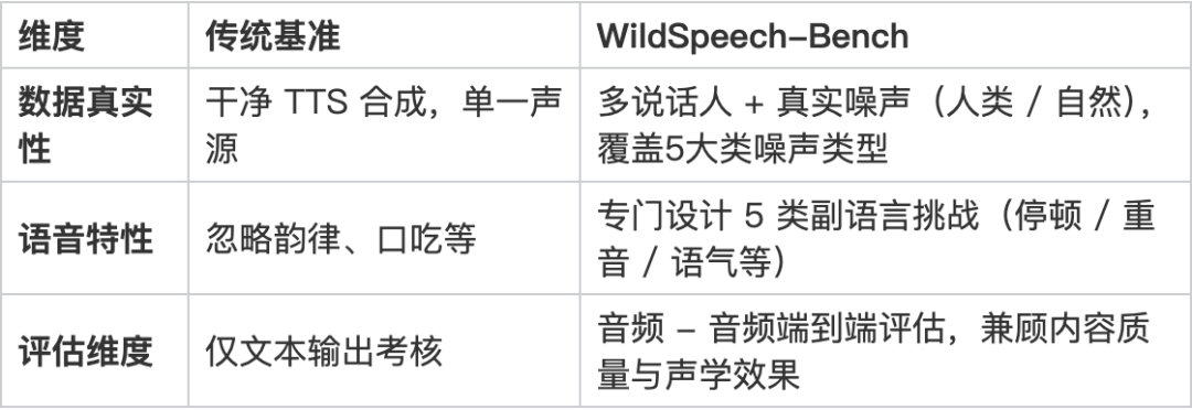 ● 传统基准多「套用文本测试框架」,忽略语音特有的韵律、停顿、同音歧义和口吃等挑战;
