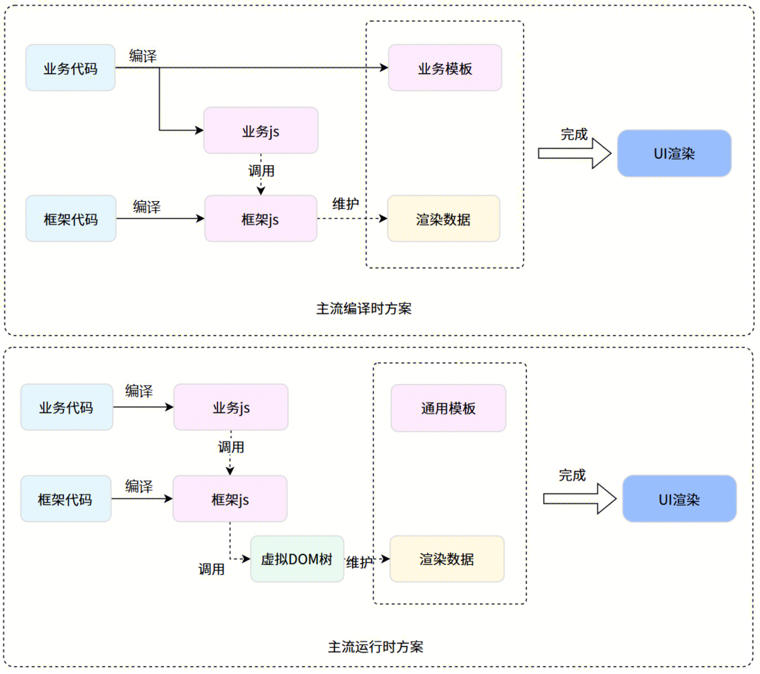 在适配微信小程序之前,我们调研了目前支持微信小程序的跨端框架。这些框架基本都是基于前端技术,在微信小程序上基本采用编译时或者运行时方案,最终都是数据驱动模板完成UI渲染。如下图: