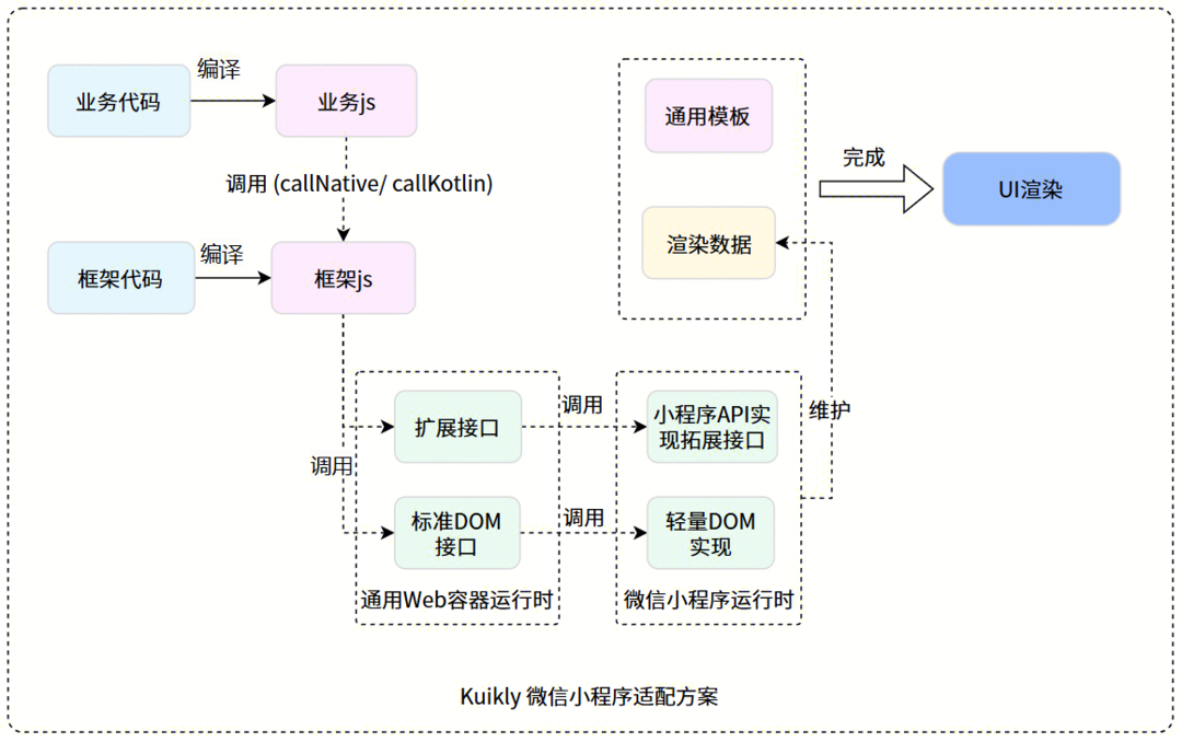 在进行Kuikly Web版H5和微信小程序适配工作时,我们发现许多代码可以共用,因此我们抽象了一个Web容器运行时作为适配层,这个适配层依赖抽象的DOM API、KuiklyWindow、KuiklyDocument,实现了绝大部分Render逻辑。