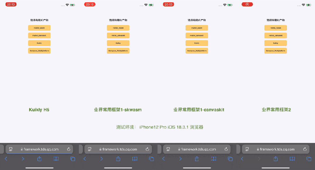 我们在iOS,Android和PC浏览器环境进行性能测试(运行Hello World Demo),Kuikly在三个浏览器环境下加载速度都是最快的。