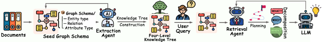 ● 四层知识树:在抽取阶段实现了跨领域知识的自主演化和高质量抽取,并把知识拆解成「属性—关系—关键词—社区」四个层次。比如,在企业知识库中,不仅能记录「产品A发布时间」(属性),还能清楚表示「产品A由团队B研发」(关系),并在此基础上形成关键词索引,最后自动聚合成社区结构。这样一来,大模型在面向不同领域回答时就能直接自动沿着知识树去定位信息,推理路径也能清晰可见;