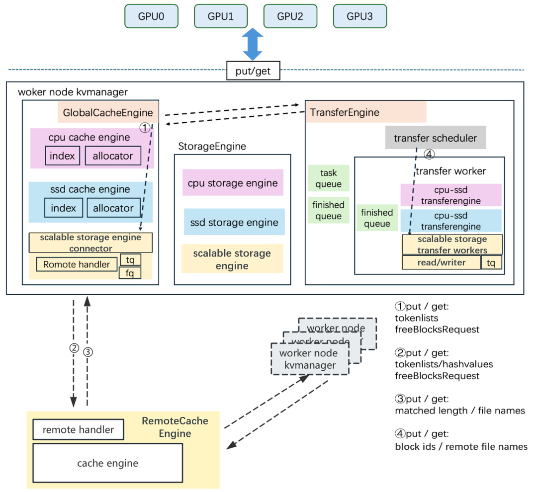 负责初始化并管理三级缓存(内存 / SSD / 扩展云存储),保持与 GPU 内部 KV 形状(shape)完全一致,通过 block ID 快速计算物理偏移。