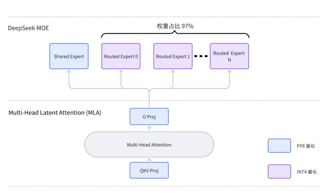 只对普通专家权重使用INT4量化,而对其他线性层保留DeepSeek原生的FP8量化方式;