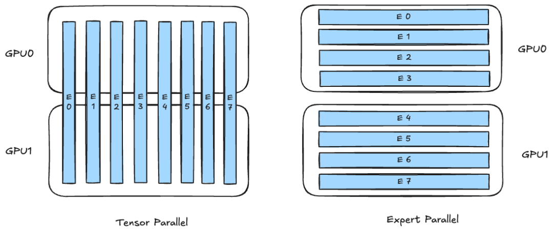 大模型中的MoE模块推理时一般有两种并行策略:TP并行(Tensor Parallel)和 EP并行(Expert Parallel),如下图所示。 EP并行时,每个 GPU 负责一部分专家(Experts),不同 GPU 上的专家各不相同,而TP并行是将单个专家(例如 MLP 的权重矩阵)在多 GPU 之间做切分,共同计算。