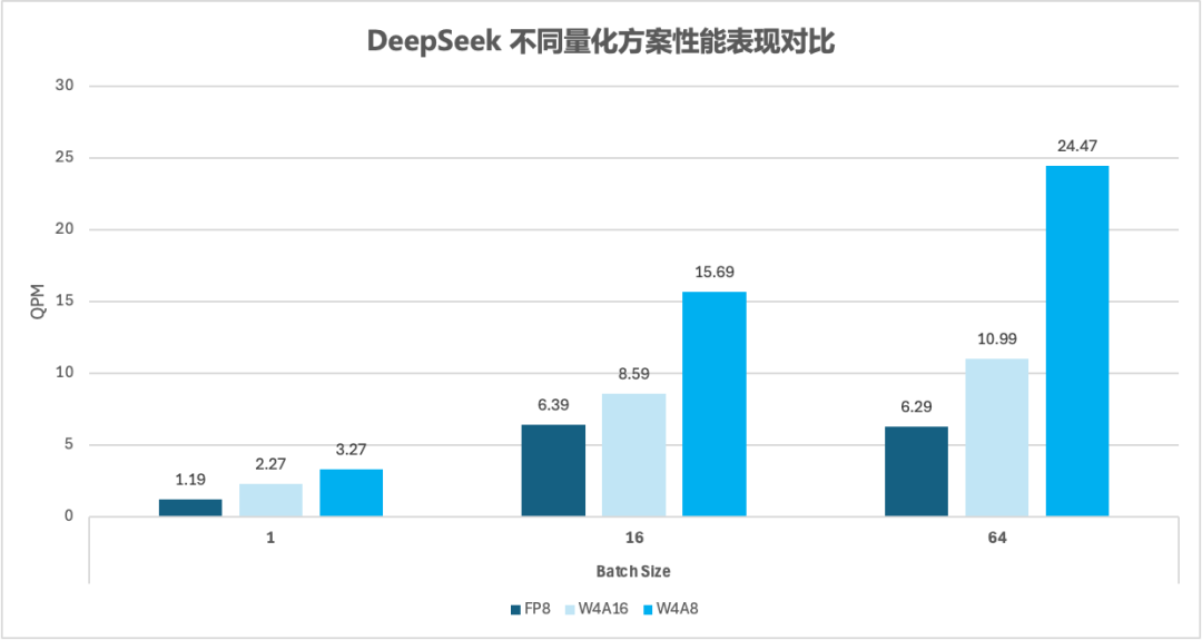 W4AFP8模型相比W4A16和FP8模型,QPM在Batch为1,16,64下的对比