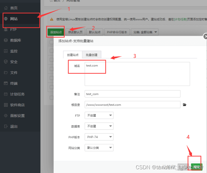 安装完成之后,登陆宝塔面板,首次进入的时候选择LNMP套件一键安装(记得这个一定要安装),然后点击面板左侧的“网站”-添加站点,输入要绑定的域名,数据库根据需要选择,如果是纯静态网站则不需要创建数据库。这里以test.com 这个域名为例