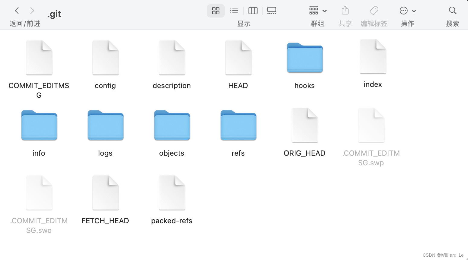 此时如果我们在 learnGit 目录中使用 command + shift + . 快捷键 (显示隐藏文件),会出现一个 .git 文件夹,这就是我们所谓的本地版本库,它是 git 版本控制系统用于存储仓库元数据和对象的目录,更是 git 的核心。它包含了 git 仓库的全部信息,包括版本历史、分支、标签、配置等。