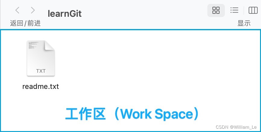 首先我们从 git 文件夹结构入手,比如我们创建了一个文件夹 learnGit 并且使用 git init 命令初始化成一个 git 文件夹,里面有一个 readme.txt 文件,那么 readme.txt 其实就处在该 git 文件夹的工作区,这点很好理解对吧。