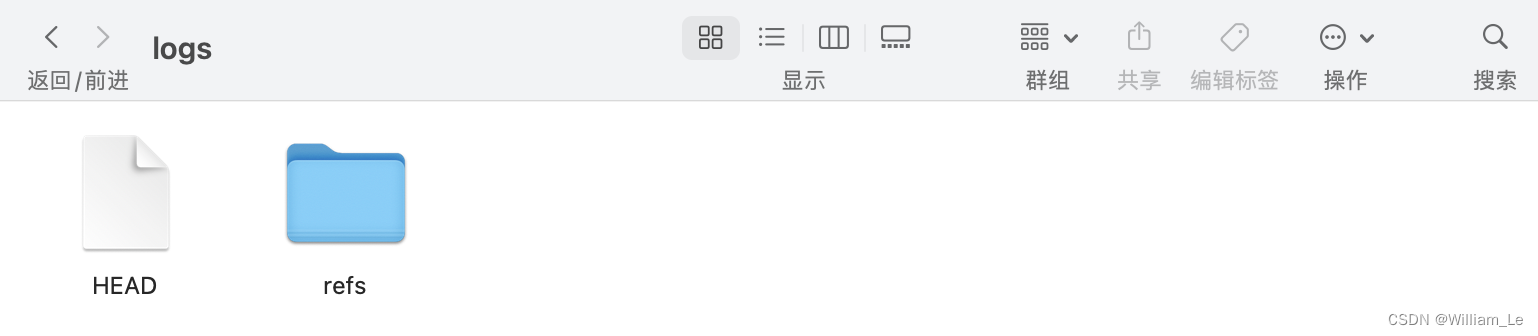 由文件夹名字不难看出这是一个用于存放记录日志的目录,logs 文件夹下又包括一个 HEAD 以及 refs 文件夹,如下图所示