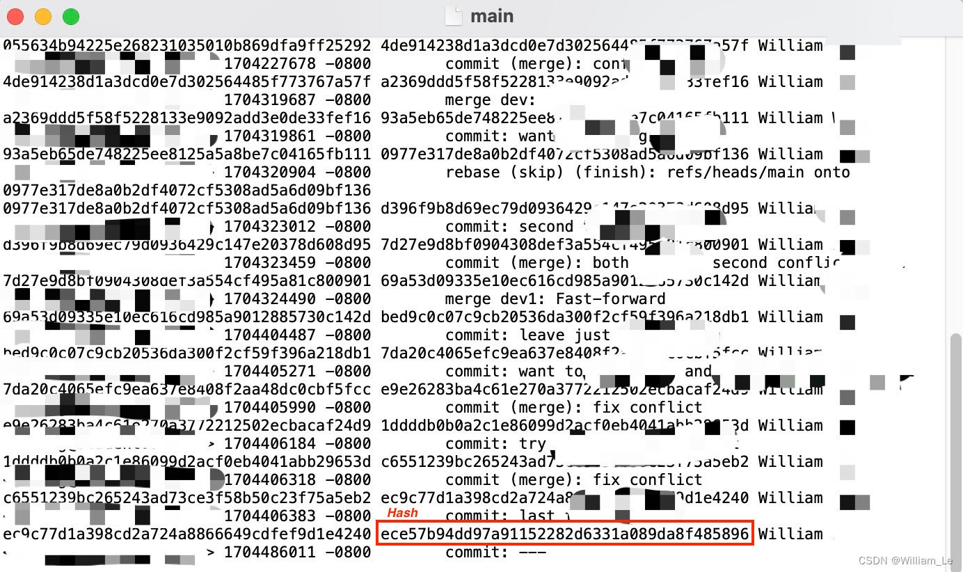 我们知道 HEAD 表示当前分支提交的最新版本,上面这个例子表示,我们目前所在的本地 main 分支上最新提交版本对应的 reference (快照) 是 ece57b94dd97a…5896 这个 Hash 码,由此我们得出结论,在获取历史提交版本时是以 commit 对应的 Hash 码作为依据找到对应的提交版本,这个 Hash 码在 .git/logs 日志中可以找到。