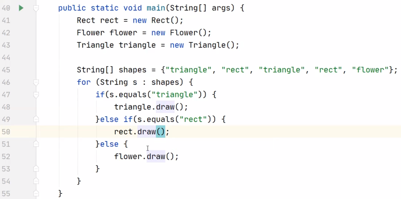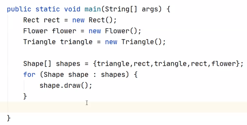 - 在 draw 方法前加上 abstract 关键字, 表示这是一个抽象方法. 同时抽象方法没有方法体(没有 { }, 不能执行具体代码).