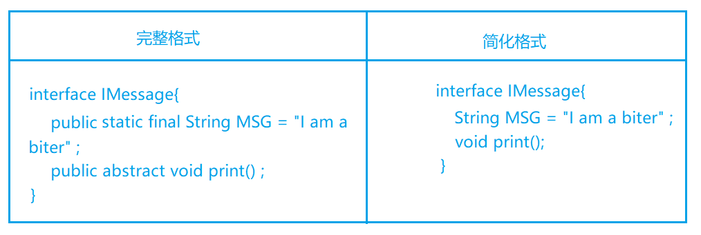 - 接口中的方法一定是抽象方法, 因此可以省略 abstract