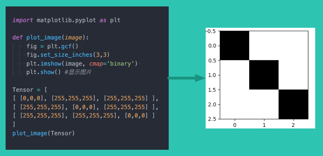 我们试试用 Tensor 来表示一张 像素 3*3 、背景为白色、对角线为黑色的图片: