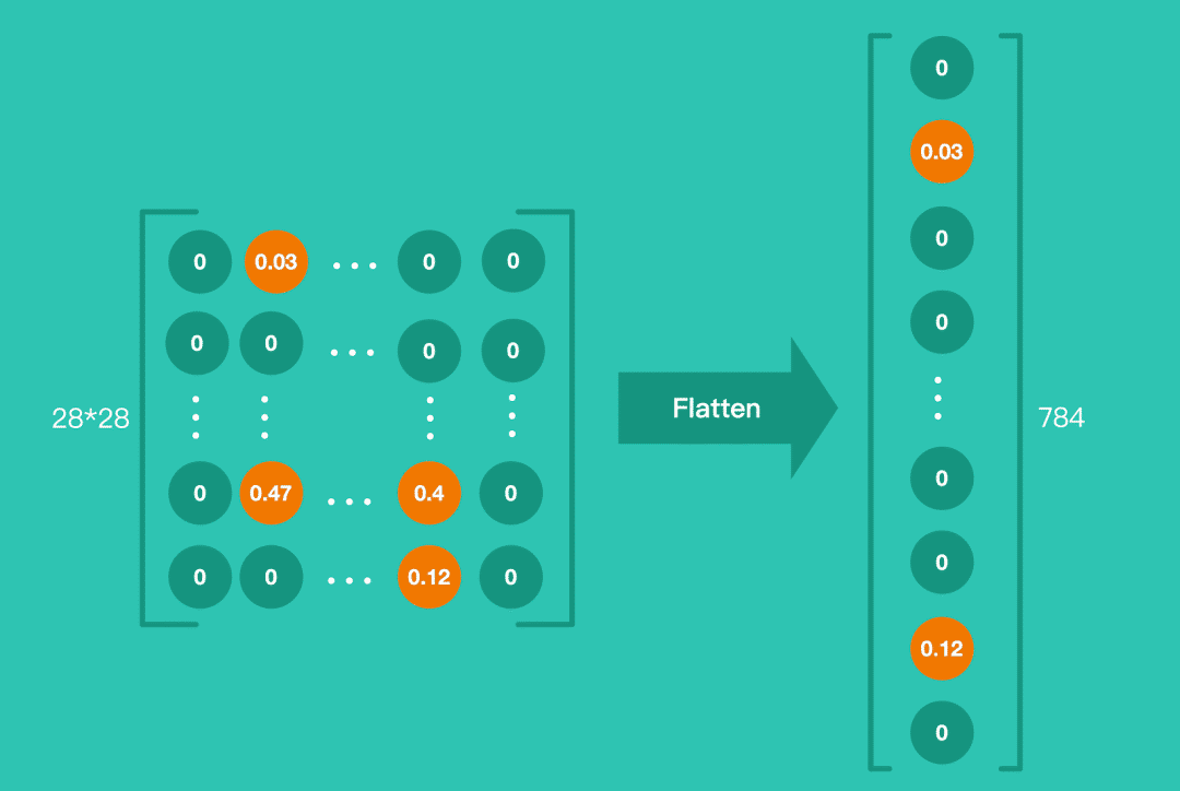 Demo 当中,第一个 Layer 就是把就是把 28*28 的图片展开成一个包含 784 个神经元一维数组。