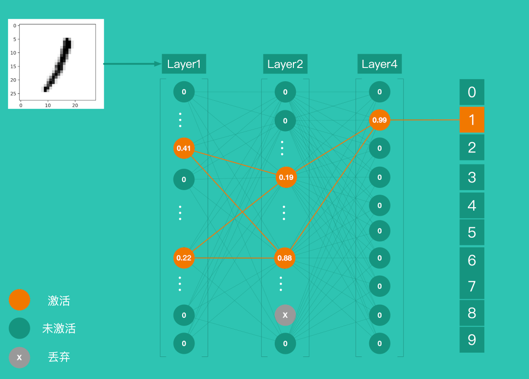 例如 Demo 中,Layer1 输出 784 个神经元,并不是全部激活的。而只有激活神经元才能对 Layer2 产生刺激,而 layer4 输出10个神经元,其中第 2 个神经元激活,表示识别结果为 1 的概率是 99%。