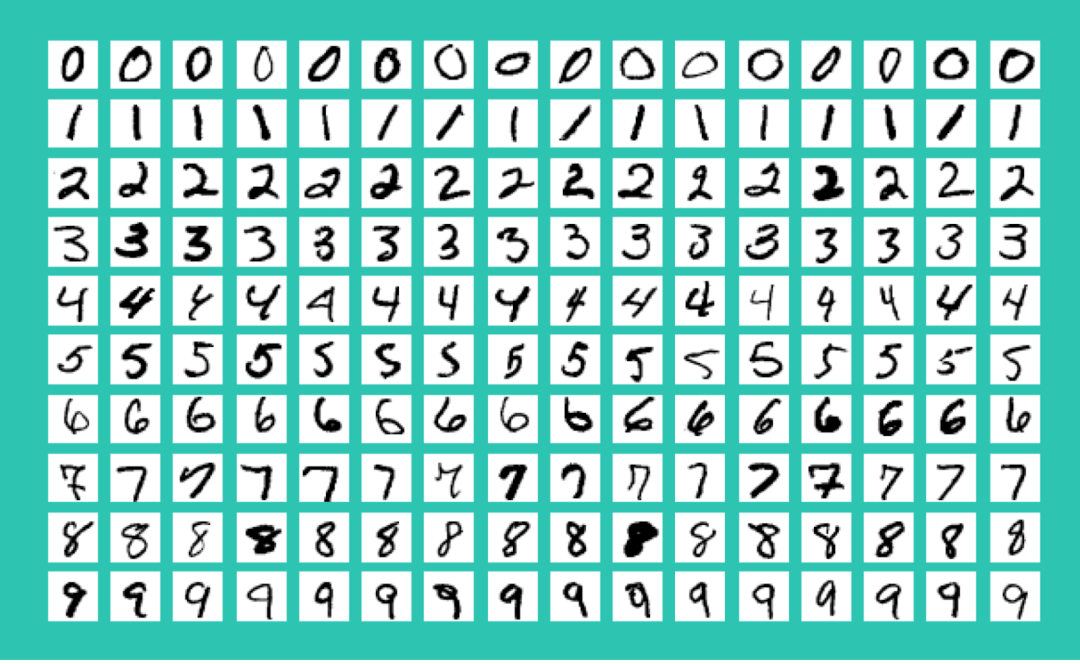 「MNIST」(Mixed National Institute of Standards and Technology database) 是美国国家标准与技术研究院收集整理的大型手写数字数据库,包含 60,000 个示例的训练集以及 10,000 个示例的测试集,里面的图片长这样。