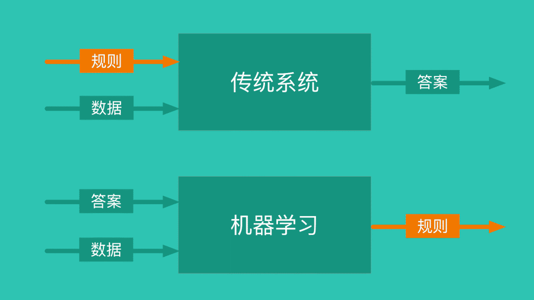 「机器学习」的目标就是利用已有答案来寻找规则,从而做出预测。这与「传统系统」的区别在于: