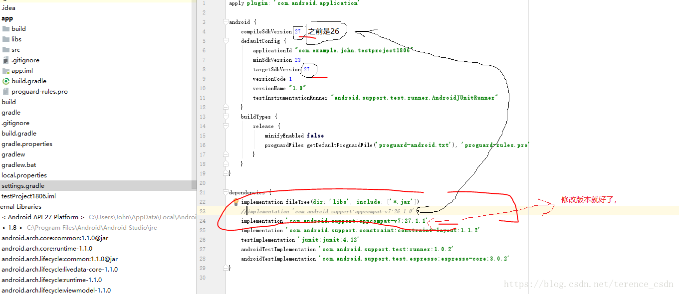 implementation 'com.android.support:appcompat-v7:27.1.1',修改如下的如下图