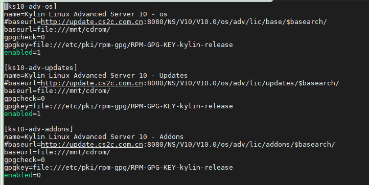 6) 修改 ks10-adv.repo文件(以kylin v10为例, /etc/yum.repos.d文件夹中) ,将地址替换为cdrom