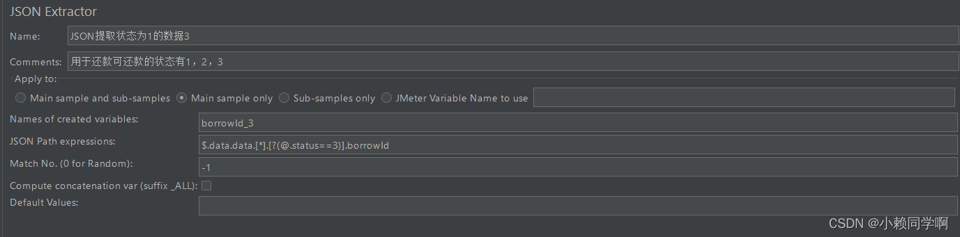 Match No. (0 for Random):0代表随机,就是JSON路径取出来的可能有多个值,0就是随机取一个,要取第一个,那么就填1即可。-1
