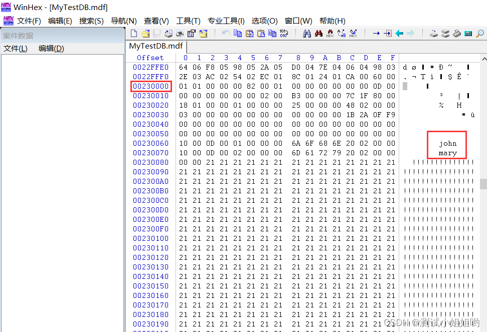 从WinHex 上看,果然是在偏移为 0x00230000 这个数据页上。