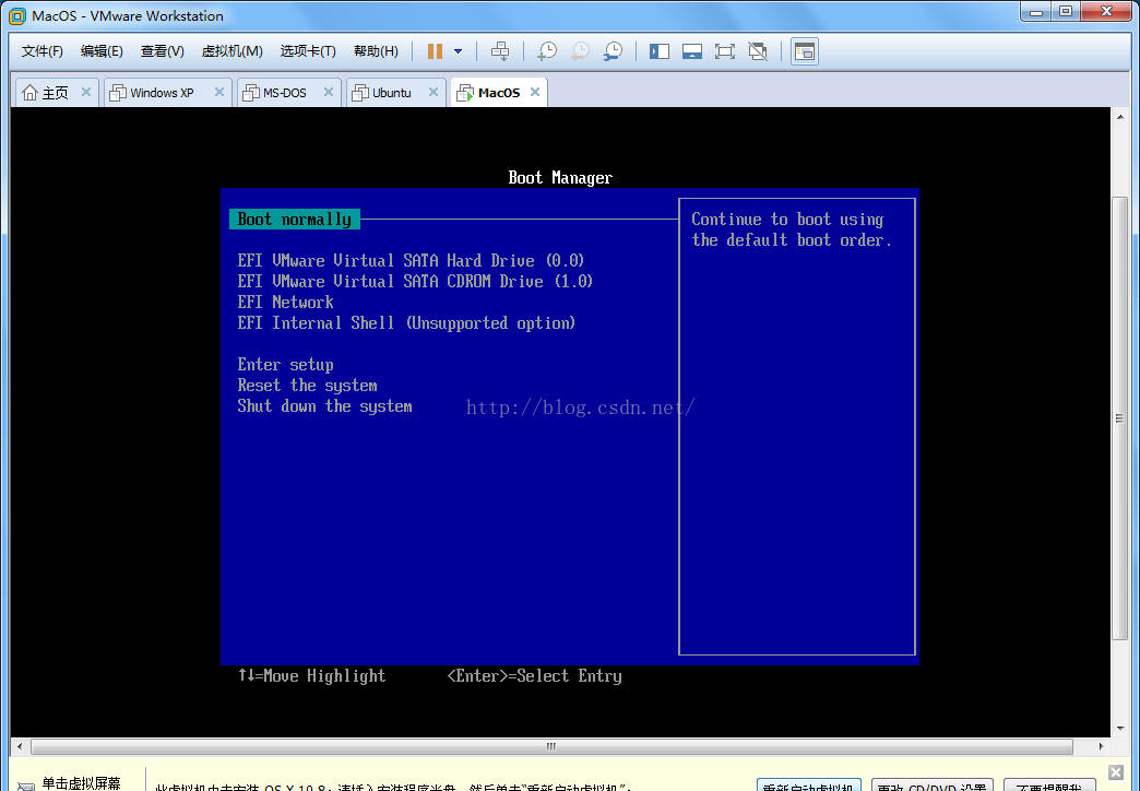 好吧,为VMware添加Apple Mac OS X类型操作系统支持,再使用dmg和iso两种格式测试,这时跳出下面的界面,还是不能从光盘启动。