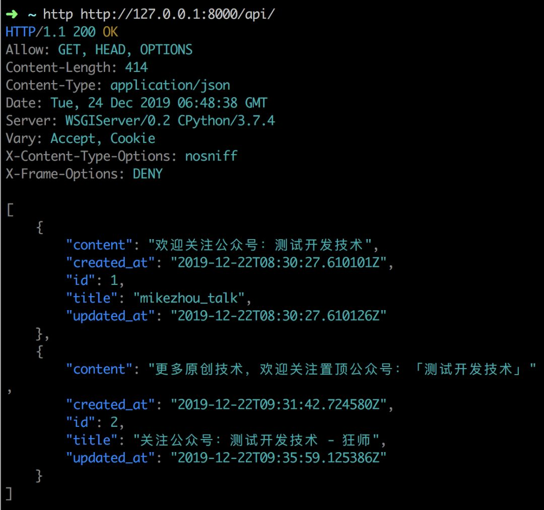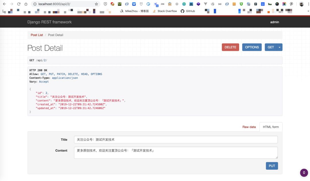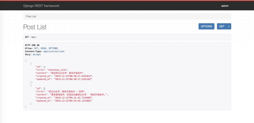 4、更新完成之后,重新访问查看api列表http://127.0.0.1:8000/api,如下所示,发现列表中的第二篇文章,已经是我们更新后的内容了。