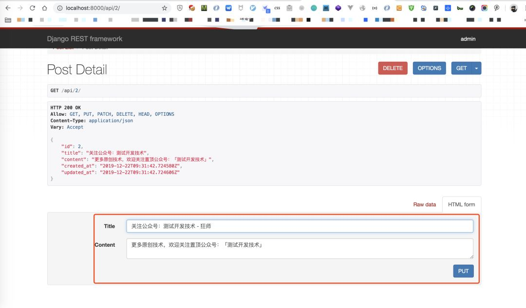 在详细视图中,您可以使用“Delete”按钮来删除内容,“Put”来更新内容,“Get”可以像以前一样获取它。例如,此外我们希望更新第二篇贴子的内容,在Title后面增加“狂师”二字,增加后点击PUT按钮,即可完成更新。