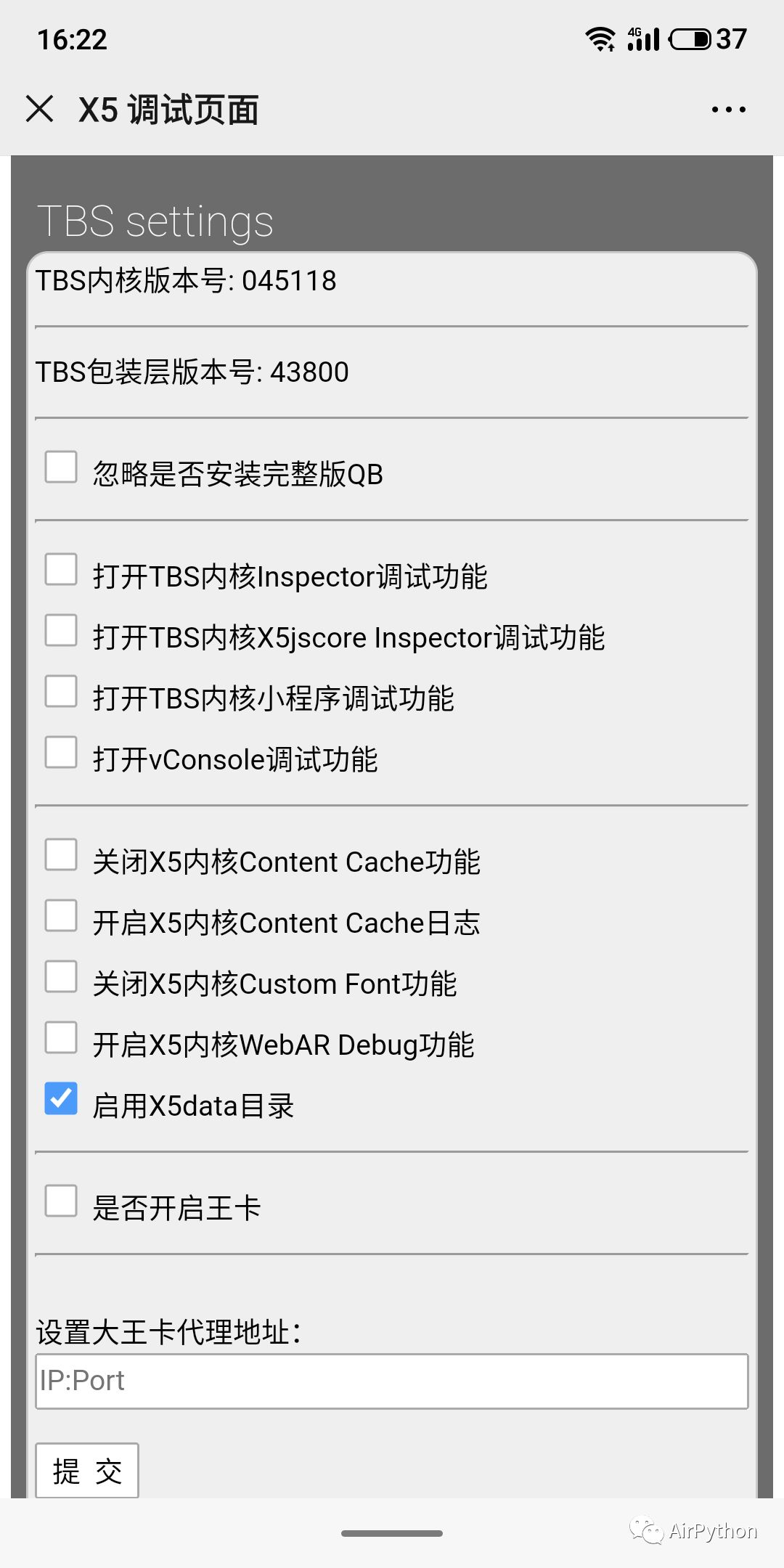 首先,需要打开微信的调试功能,文件传输助手中输入:debugx5.qq.com 进入,勾选上 :打开 TBS 内核 Inspector 调试功能。