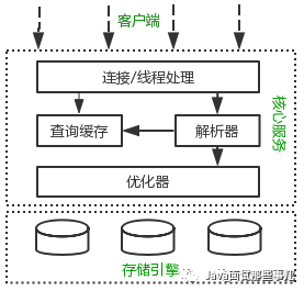 最下层为存储引擎,其负责MySQL中的数据存储和提取。和Linux下的文件系统类似,每种存储引擎都有其优势和劣势。中间的服务层通过API与存储引擎通信,这些API接口屏蔽了不同存储引擎间的差异。