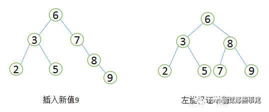 显然图②不满足平衡二叉树的定义,而图①是一课平衡二叉树。平衡二叉树的查找性能是比较高的(性能最好的是最优二叉树),查询性能越好,维护的成本就越大。比如图①的平衡二叉树,当用户需要插入一个新的值9的节点时,就需要做出如下变动。