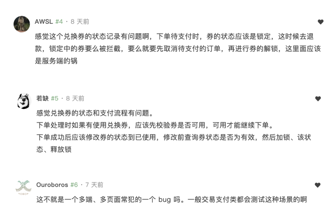 按问题描述的步骤,就能测出该问题了。大部分同学把这个问题归咎于测试用例设计不全或者是漏测。也有同学提出了告警和监控,那又是另外一个层面的事情了。