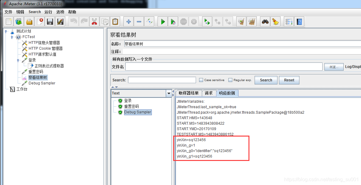 9、查看正则表达式提取的数据是否正确,可以通过debug sampler查看;