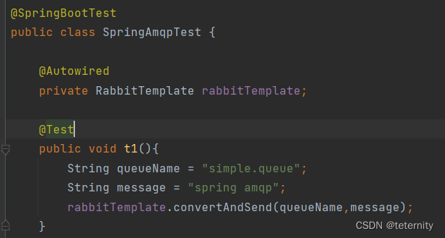 3.在发送者publisher类的测试类中新建测试类并创建方法,在类中注入RabbitTemplate依赖,通过调用其方法convertAndSend方法即可完成消息的发送
