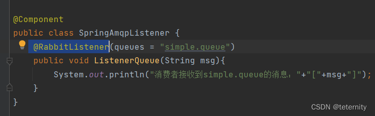 2.创建一个新的listener包,创建新的类。在该类添加@component注解交给spring容器管理,在类中创建一个方法,添加@RabbitListener注解并指定之前消息发送队列的名称,在方法的形参列表中设置接受消息的类型。我在这里简单输出消息完成测试。