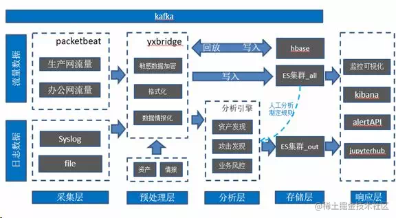 整个平台架构分了多个层次,采集层、预处理层、分析层、存储层和响应层。层之间若需要,均使用kafka作为消息队列进行数据传递,保证了传输过程中的数据可靠。