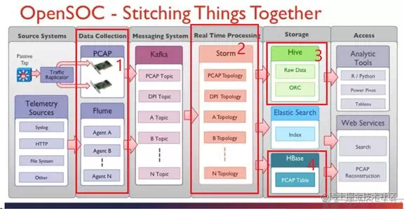 OpenSOC是思科在BroCON大会上亮相了的一个安全大数据分析架构,它是一个针对网络包和流的大数据分析框架,是大数据分析与安全分析技术的结合, 能够实时的检测网络异常情况并且可以扩展很多节点,它的存储使用开源项目Hadoop,实时索引使用开源项目ElasticSearch,在线流分析使用著名的开源项目Storm。