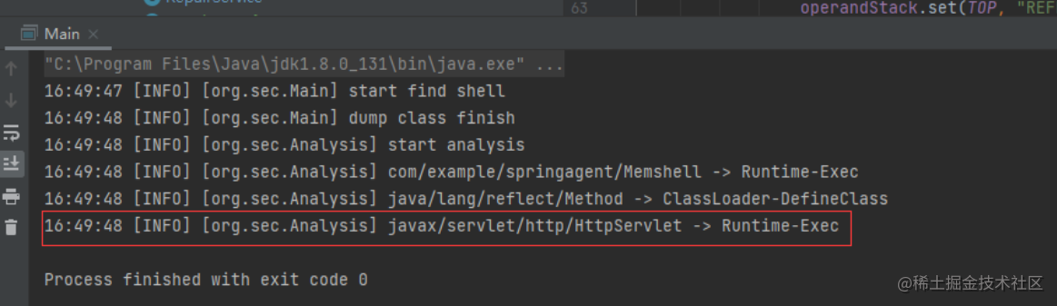 可以看到,字节码分析的过程比较简单,尤其是Runtime.exec的普通执行命令内存马,很容易绕过,但个人认为这已足够,因为之前的一些条件已经限制了分析的类是不可能包含Runtime.exec的黑名单类,且大多数用户都是脚本小子,使用免杀型内存马的可能性不大。大多数用户可能直接用了现成的工具,例如冰蝎型内存马的检测方式已完成,暂时来看这样做是足够的,没有必要加入各种免杀检测手段