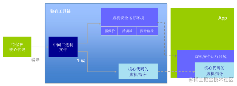 虚机源码保护为用户提供一套完整的工具链,首先把用户待保护的核心代码编译成中间的二进制文件,随后生成独特的虚机源码保护执行环境和只能在该环境下执行的运行程序。