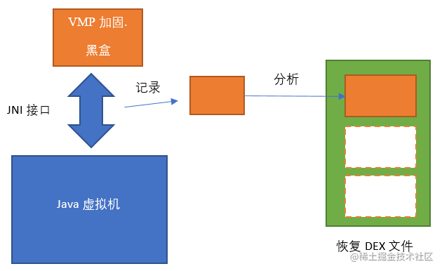 不论使用指令转换/VMP加固的A方案或者B方案,其必须通过虚拟机提供的JNI接口与虚拟机进行交互,攻击者可以直接将指令转换/VMP加固方案当作黑盒,通过自定义的JNI接口对象,对黑盒内部进行探测、记录和分析,进而得到完整DEX程序。