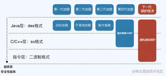 传统App加固技术,前后经历了四代技术变更,保护级别每一代都有所提升,但其固有的安全缺陷和兼容性问题始终未能得到解决。而新一代加固技术—虚机源码保护,适用代码类型更广泛,App保护级别更高,兼容性更强,堪称未来级别的保护方案。