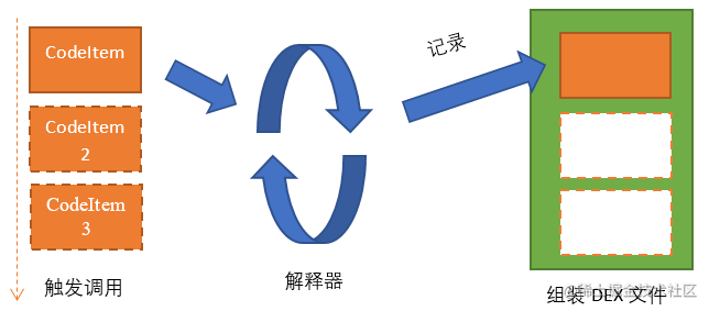 B.加载之后将函数内容恢复到虚拟机内部的结构体上:虚拟机读取DEX文件后内部对每一个函数有一个结构体,这个结构体上有一个指针指向函数内容(CodeItem),可以通过修改这个指针修改对应的函数内容。