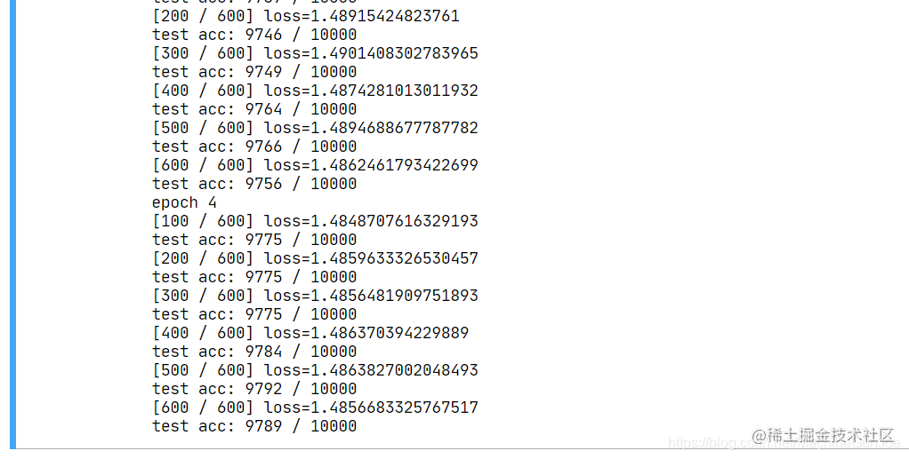 def fit(net, epoch=1):net.train()run_loss = 0for num_epoch in range(epoch):print(f'epoch {num_epoch}')for i, data in enumerate(train_loader):x, y = data[0], data[1]outputs = net(x)loss = criterion(outputs, y)optimizer.zero_grad()loss.backward()optimizer.step()run_loss += loss.item()if i % 100 == 99:print(f'[{i+1} / 600] loss={run_loss / 100}')run_loss = 0test(net)