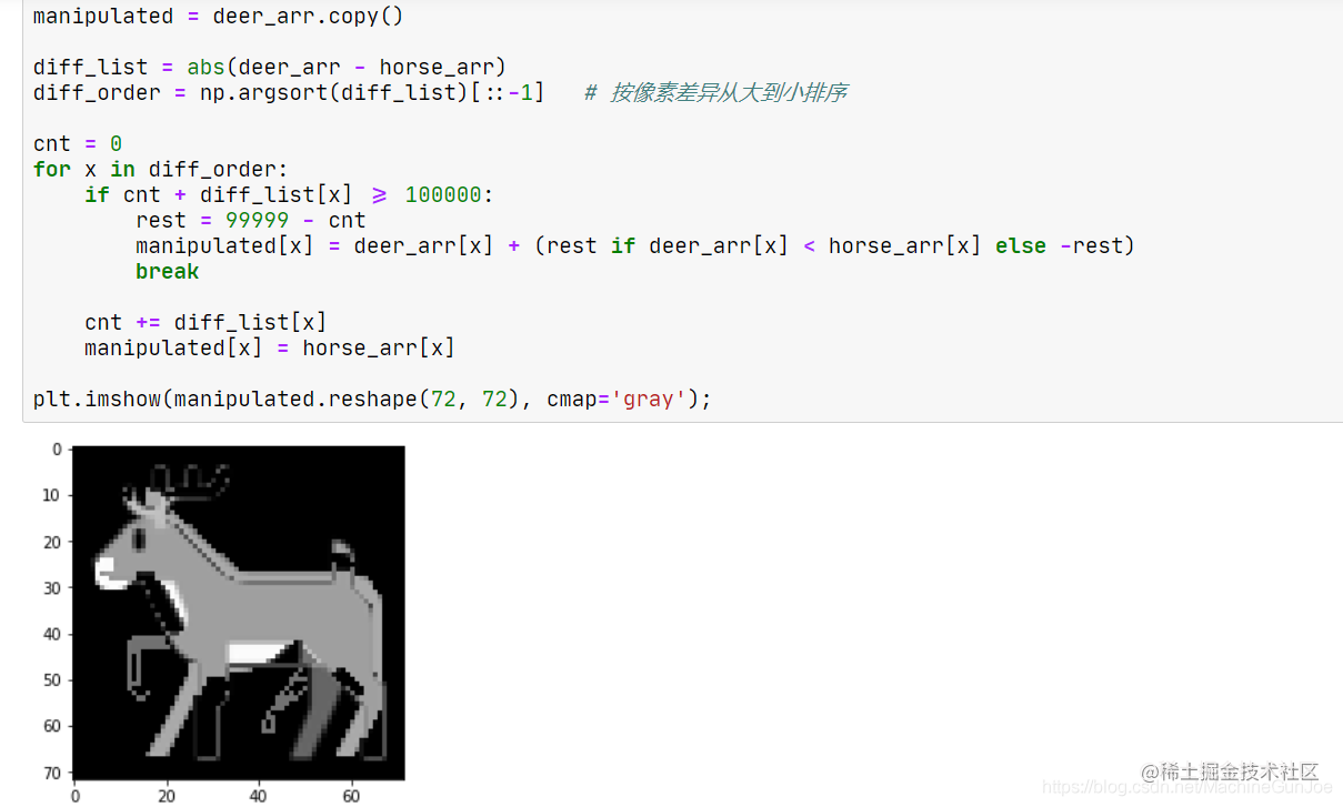 可见与鹿的距离是 4003,与马的距离是 2538,骗过了 AI。像素差异是 99999,我们成功完成了题目指定的目标。