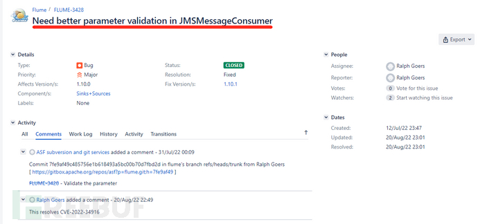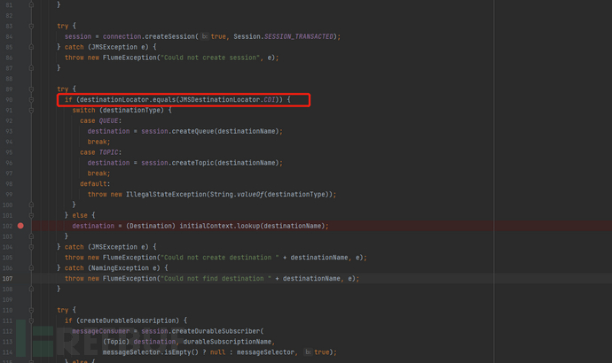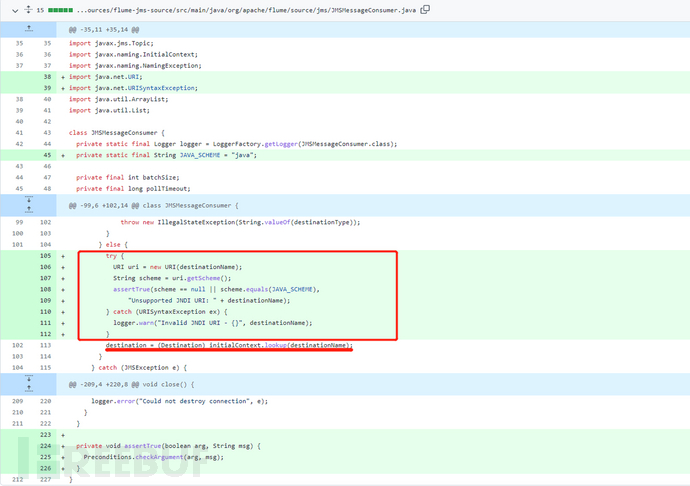 查看DIff(https://github.com/apache/flume/commit/7fe9af49)记录发现,修复方式是在JMSMessageConsumer中的else分支下,在initialContext.lookup(destinationName)前新增了对destinationName的校验。